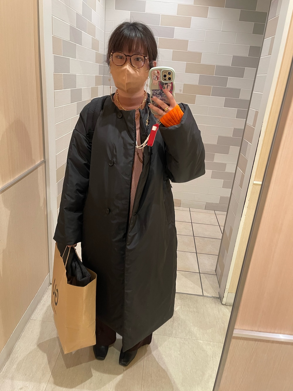 ブラックコーデ意識したけど、オレンジの差し色をポイントにした‼️ ダウンジャケットは初おろしだけど、軽くて凄く気に入った➰❤︎