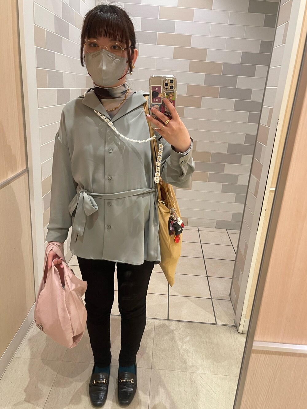 シアートップスにダイダイ柄を着ることでシャツのアクセントになってます‼️ 上が淡色なので下は黒でしめました🫶🏼🖤