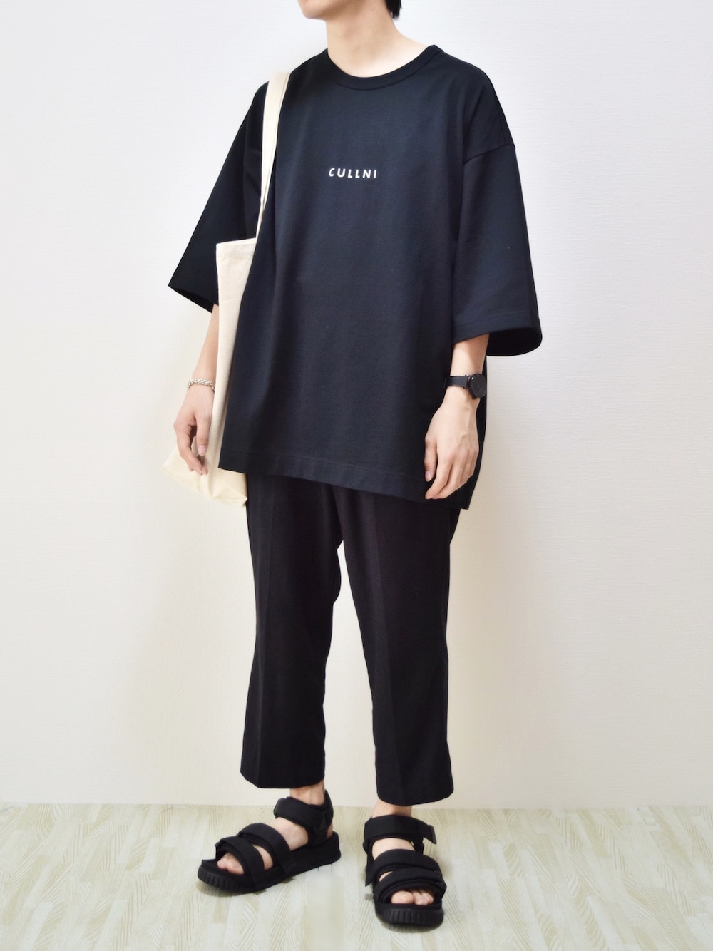 見て頂きありがとうございます! 室内撮りになりました🙋♂️ 見やすくできたかなと思います😊✨ オールブラックのゆるコーデ🌚 Vシルエットで、 手首と足首は見せて涼しげにしました❄️