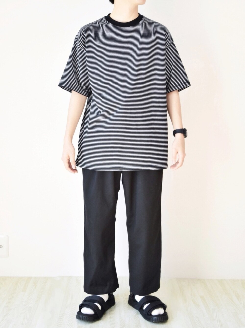いつも見て頂きありがとうございます😊 サンダルと白靴下に合うのを色々試し、 モノトーンのボーダーに落ち着きました🐼 白靴下でさわやかさをプラスです!☀️