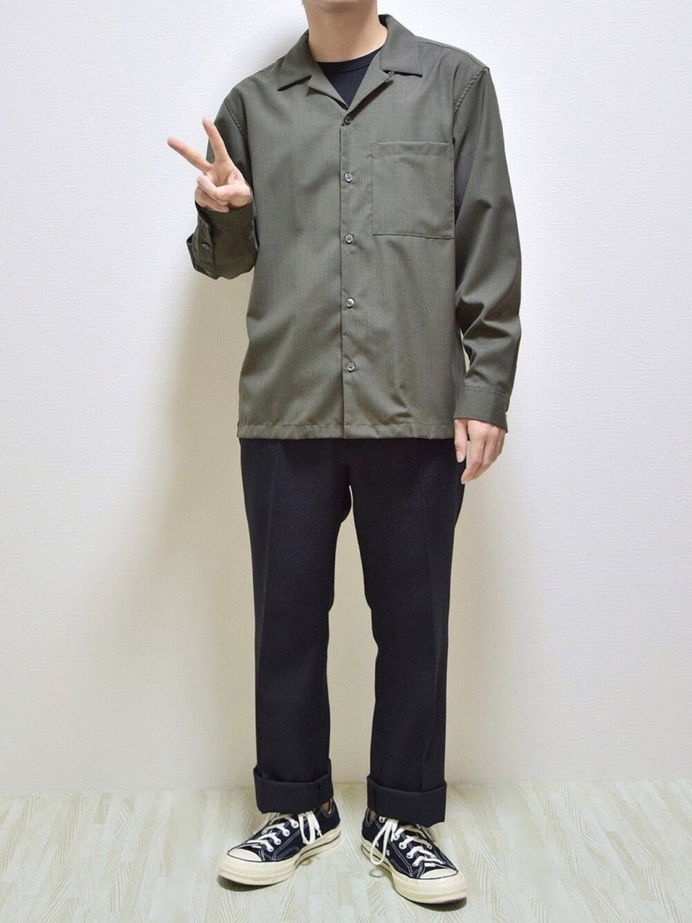 見て頂きありがとうございます😊 ラブアンドピース2020🌿 お気に入りのカーキのシャツを ブラックのアイテムと🌚 パンツは2回ロールアップしても シルエット綺麗で嬉しい☺️ ▷ ▷ 今再販してます!