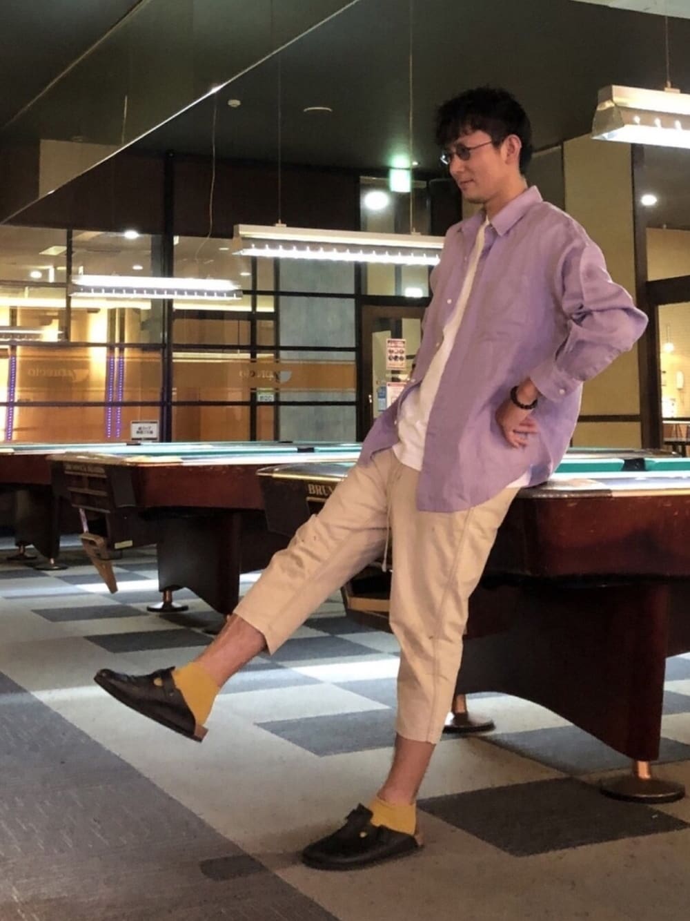 !!着回し3部作2作目!! 1作目のシャツを紫色にしてみたよ! 一作目よりもなんか垢抜けてる感出てる気がする! それよりもポーズ! 今まで撮られ慣れしてないせいで棒立ちか照れ隠しにハンズアップするくらいが精一杯だったけど ついに!ついに色気出しちゃった!下半身で動き作るなんて調子乗ってますね〜❤️ 空き缶蹴っ飛ばしてるのか、寝転がってるドMを足で蹴付いてるのかわかんないけど謎の右足が短いですね〜😂 ポイントとしてはまぁ紫シャツは、濃い顔おっさんでも多少はマイルドにしてくれるから塩顔時代に対応できない俺とかは特に感謝して着させて頂くべき!