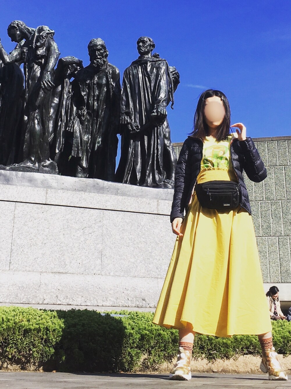 #tshirt : #キムラトモミ @kimuratomomi1974 #outer : #uniqlo #inesdelafressange #skirt : #gu #sneakers : #reebok #pumpfury #waistbag : #amazon #socks : #tutuanna 大好きプリント黄色#Tシャツ とGUイエローロング#スカート 、ゴールドポンプフューリーで東京旅行のイエローコーデ✨ 引き続き東京旅行コーデの一枚です✨ 上野に行く機会があったので、国立近代美術館のロダンの彫刻前で撮影😊 引き続きデザフェスに行っていたのですが、会場は暑いので、必ずTシャツで行きます。 この日は大好きな作家さんのキムラトモミさんのデザインのお気に入りTシャツを着用✨ この黄色Tシャツと同じくイエローのロングスカートを合わせてイエロー同色コーデにするのがお気に入りです😊 ロングスカートはGUの品なのですが、インパクトもあって何かと重宝するアイテムでした😊 今回の#ポンプフューリー はゴールドなのでイエローコーデにぴったりなのです✨ 旅行コーデは特に動きやすさ重視のコーデになるのですが、色々な便利アイテムを使いつつ楽しんでいきたいと思います✨ #ファッション #プチプラ #プチプラコーデ #コーデ #今日のコーデ #服 #今日の服 #fashion #ootd #outfitoftheday #outfit