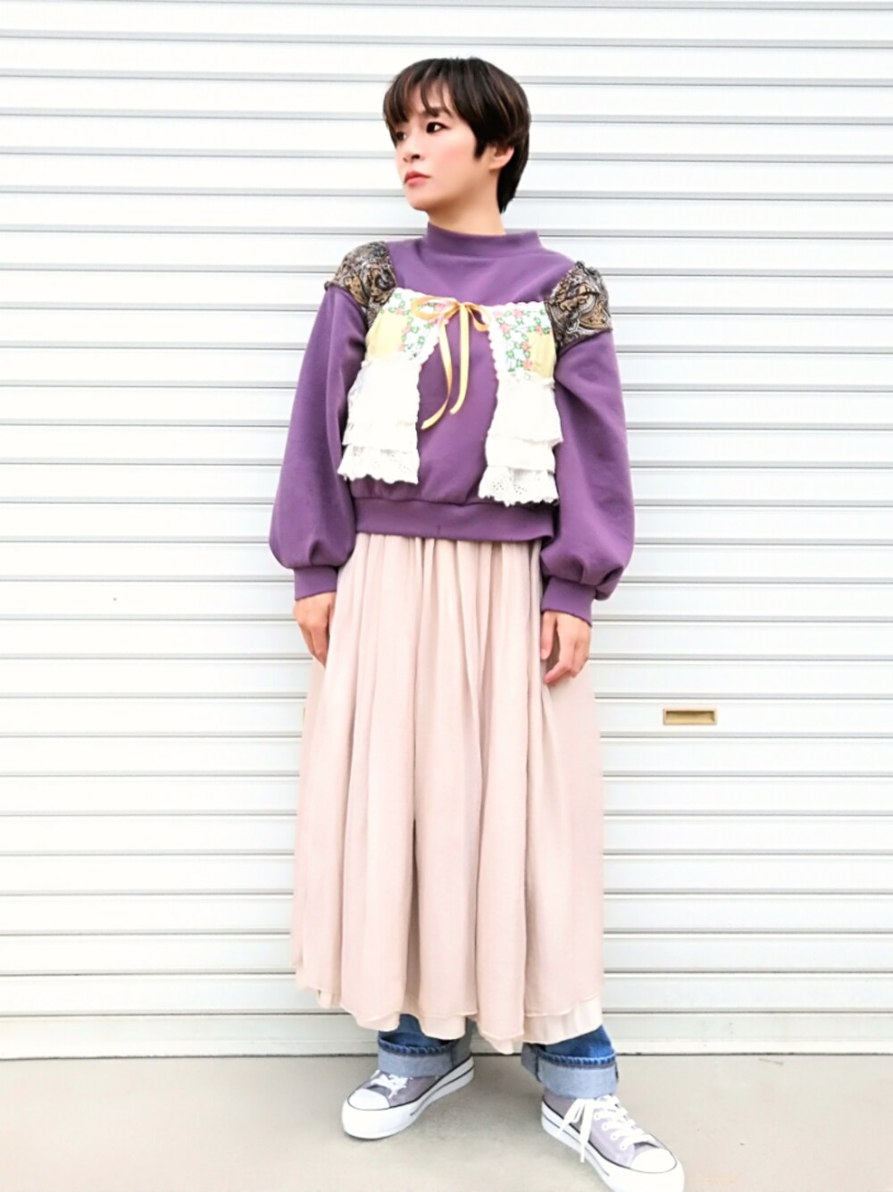 いいと思って買ったけどしっくり来てないスウェットに 10年以上前のパラビオンなどの もう着ないトップスやスカートの必要な部分を切り取って なんやかんや縫って合体させました 家庭科3の雑すぎる腕前が炸裂してるので 近くで見ると相当厳しいですが 古着テイストな服が着たかったのでその点では満足です 風でレースやリボンがひらひらしてかわいいです