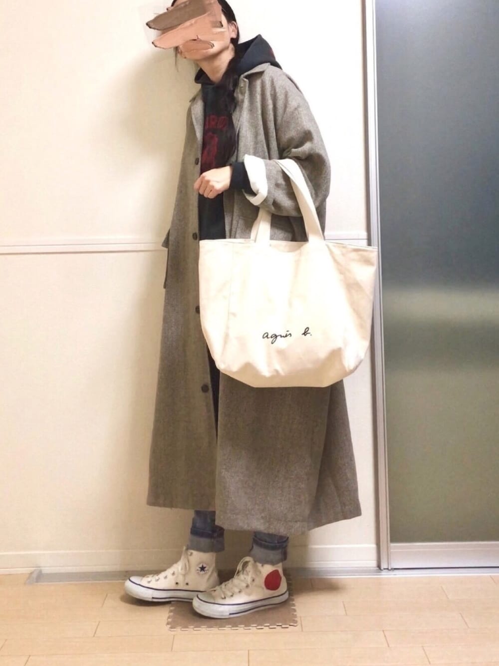 初めて蛍光灯の下で撮影しましたが微妙な感じに😅 厚めのトップスを着た時に羽織るアウターが欲しくて、 このコートはちょうど良いです🙆♀️ 後ろのデザインも好き❗️ 日の丸CONVERSEやっぱり可愛いです😍