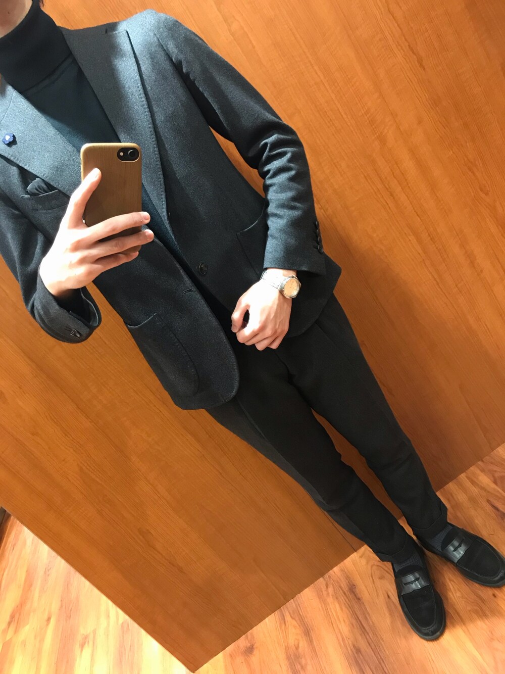 〜大人シックなモノトーンコーデ〜 シンプルだからこそ引き立つシルエット ワイドラペルのサイドベンツ 短丈で丸みのあるフロントカットにパッチポケット そしてワンタックテーパード アルベルト・スカッチョーニも気に入った型紙さすがです。 個人的に有彩色の方が好みでよく着るのですが ふとした時に着る無彩色のギャップにとても魅かれます
