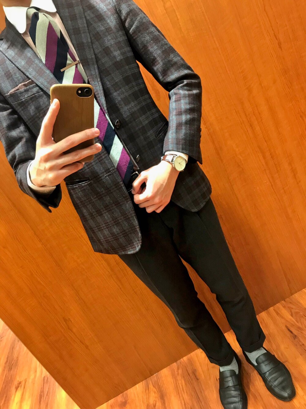 〜パターンonパターン〜 タータンチェックは1柄 遠目無地のグラフチェックは0.5柄 リバースストライプは1柄 計2.5柄以内のコーディネート。 柄と柄も組み合わせ方次第でこなれた感じに