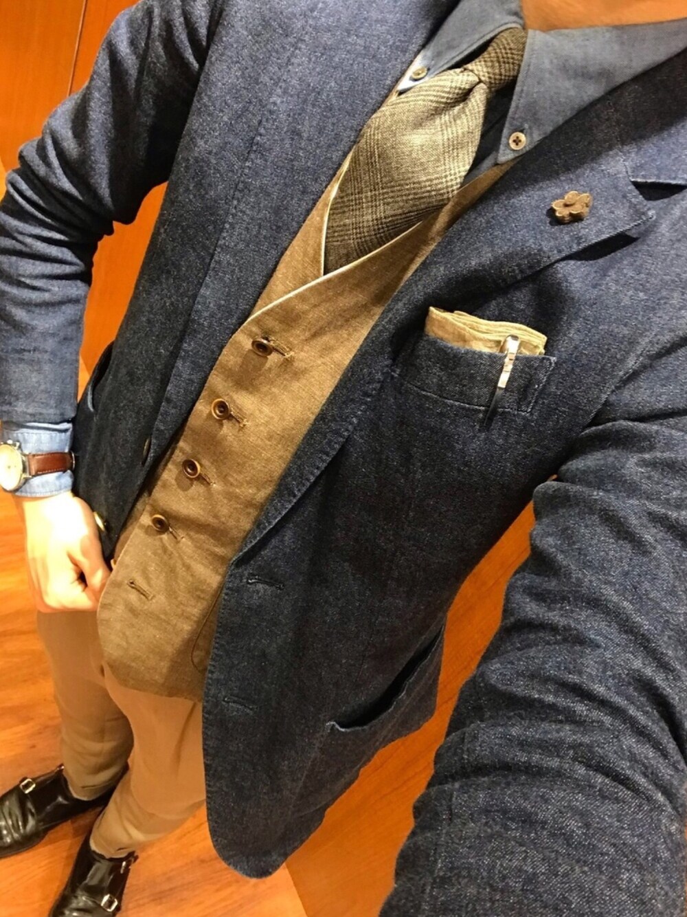 〜デニムonデニム〜 春夏へ移行しました。 デニジャケにシャンブレーシャツ リネン混ベストにコットンパンツ 春夏素材でたっぷり遊んでみました