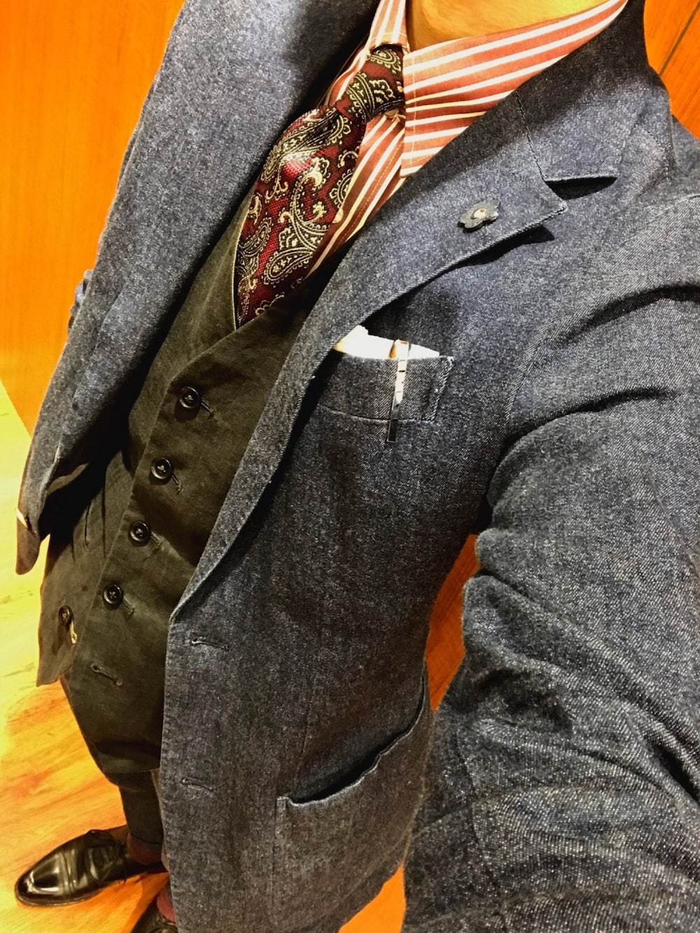 〜ストライプonペイズリー〜 赤ロンストタブカラーに 赤ペイズリータイの柄×柄パワーコーデ ベストを挟みインナーのカラーインパクトを軽減しバランスを取っております