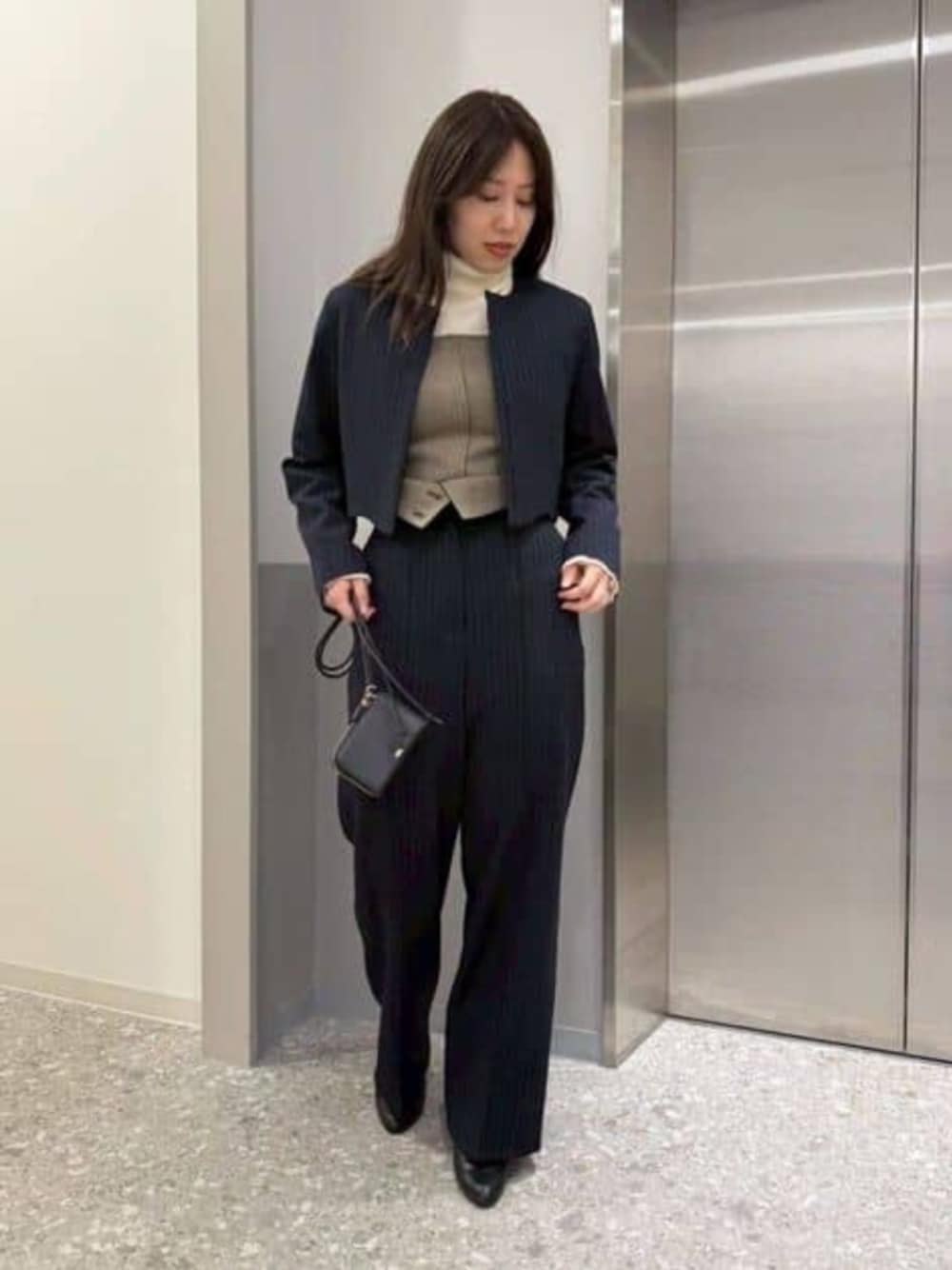 【Jacket】 ストライプ柄の短丈のブルゾンです! ノーカラーで、全体的にすっきりシルエット◎ 【Pants×Bustier】 パンツとビスチェがセットになっています! メタルボタンデザインのハイウエスト仕様 ハイウエスト部分の裏生地が ビスチェ素材とリンク! とにかく脚を長く、すらっと見せてくれます!👀 【Knit】 袖はフリルになっている、 タートルネックニット🧶 肌触りも柔らかく温かみがあります! ビスチェなどのアイテムとレイヤードしやすい ワンポイントデザインニットは、マストバイです!