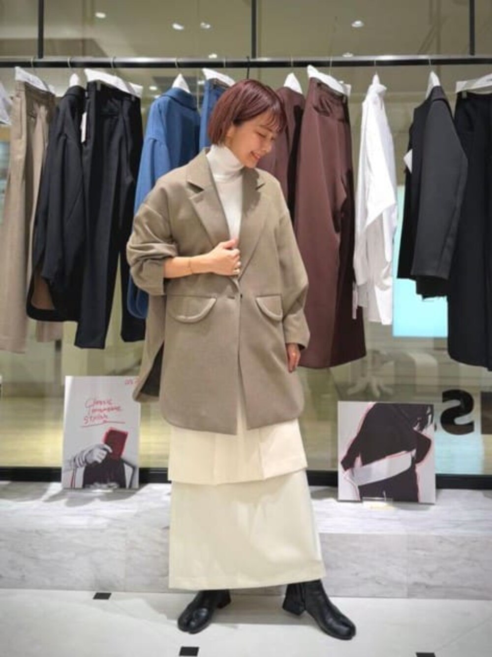 CIS.のジャコットにレイヤードスカートを合わせました。 ベージュのジャコットを主役にしたかったので、ホワイトカラー合わせにしました。 冬のホワイト×ベージュ合わせは、女性らしさもあっておすすめです! マニッシュなイメージのジャコットですが、スカートを合わせると優しい印象に。 オーバーサイズのデザインが今っぽくて◎ ジャケットとしてもアウターとしてもおすすめです。 着用感はとても軽いです。ゆとりあるデザインなので、中にデザインある厚手のトップスなども合わせられます。