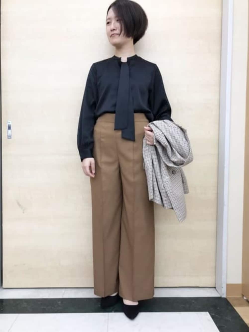 パンツ→着用サイズM Mサイズは、ウエスト周りにゆとりがあります。 車の運転時など、座った時に余裕が欲しかったためMサイズにしました。 ウエストにゴムがついているため、楽に履けます。 シワにもなりにくい素材のため、運転が長い日でも安心して着用できています。 ソフトブラウス→着用サイズS サイズはSで丁度いいです。 光沢がややあり、ストレッチも効いており着やすいです。 また、ボウタイは取り外しもできるため、そのまま着けてもリボンにしても、なしでも着られるため、様々な着こなしができます。