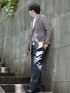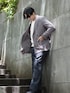 今回特に気に入ったパープルのヘリンボーンの ジャケットを主役にして、 VネックのニットとTシャツをレイヤードして チャコールのイージーパンツで ストイックなカラーリングでまとめました。