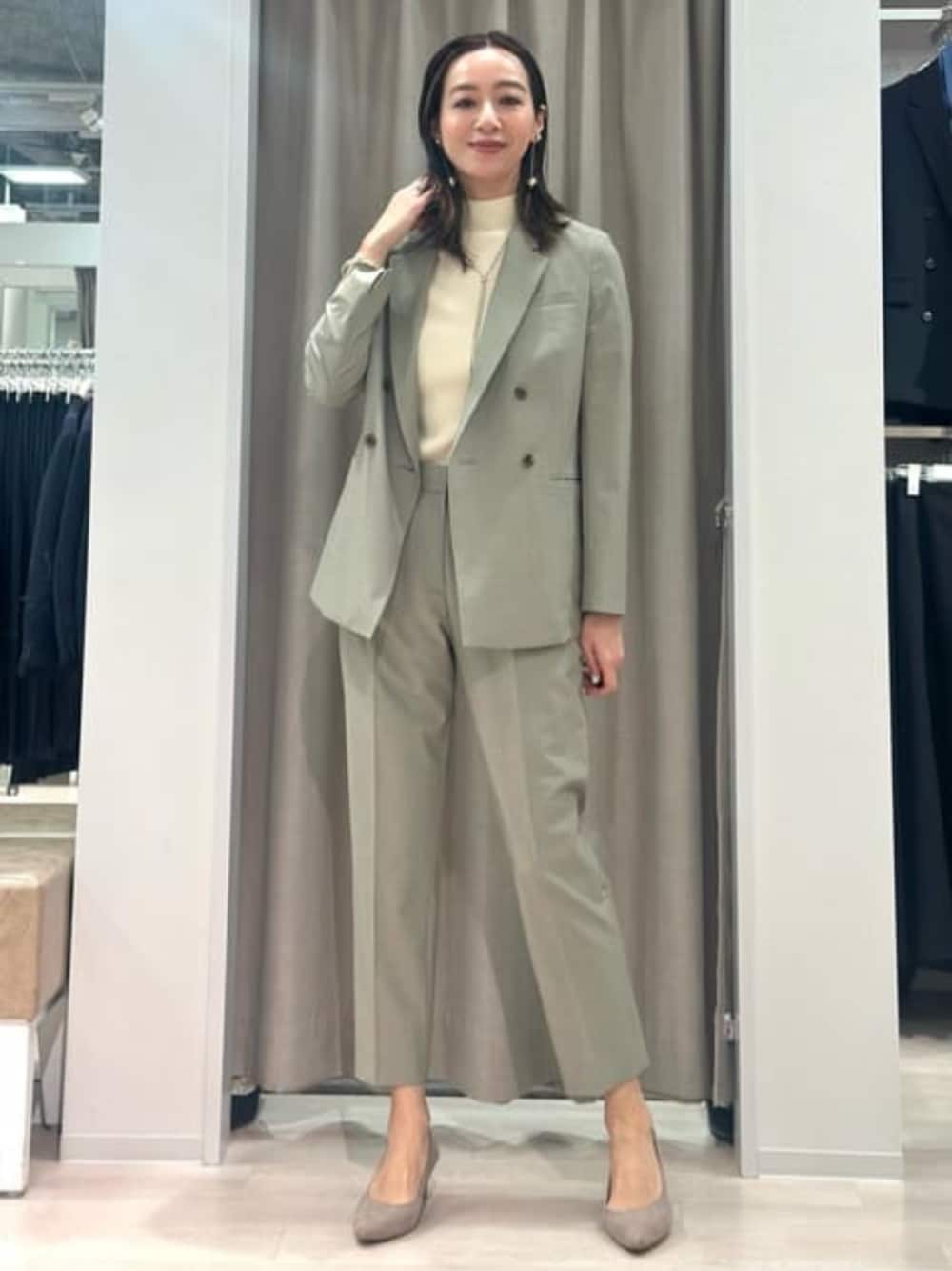 🏷️ジャケット 普段着用サイズ:M ストレッチが効いてる&スッキリめに着たかったので38にしましたが、背中は若干パツンと感じたのでゆったり着たい方は40がおすすめ! 1サイズあげると前から見たバスト周りにゆとりがでますが、腕や背中は圧倒的に楽になるはず^_^ 🏷️パンツ 普段着用サイズ:M ハイウエストなのでキツすぎないので普段選ぶサイズで良いかと思います! ちょっとストレートっぽい型なのでふくらはぎが張ってる方も、座って立つ時裾がすとんと落ちるので安心です^_^