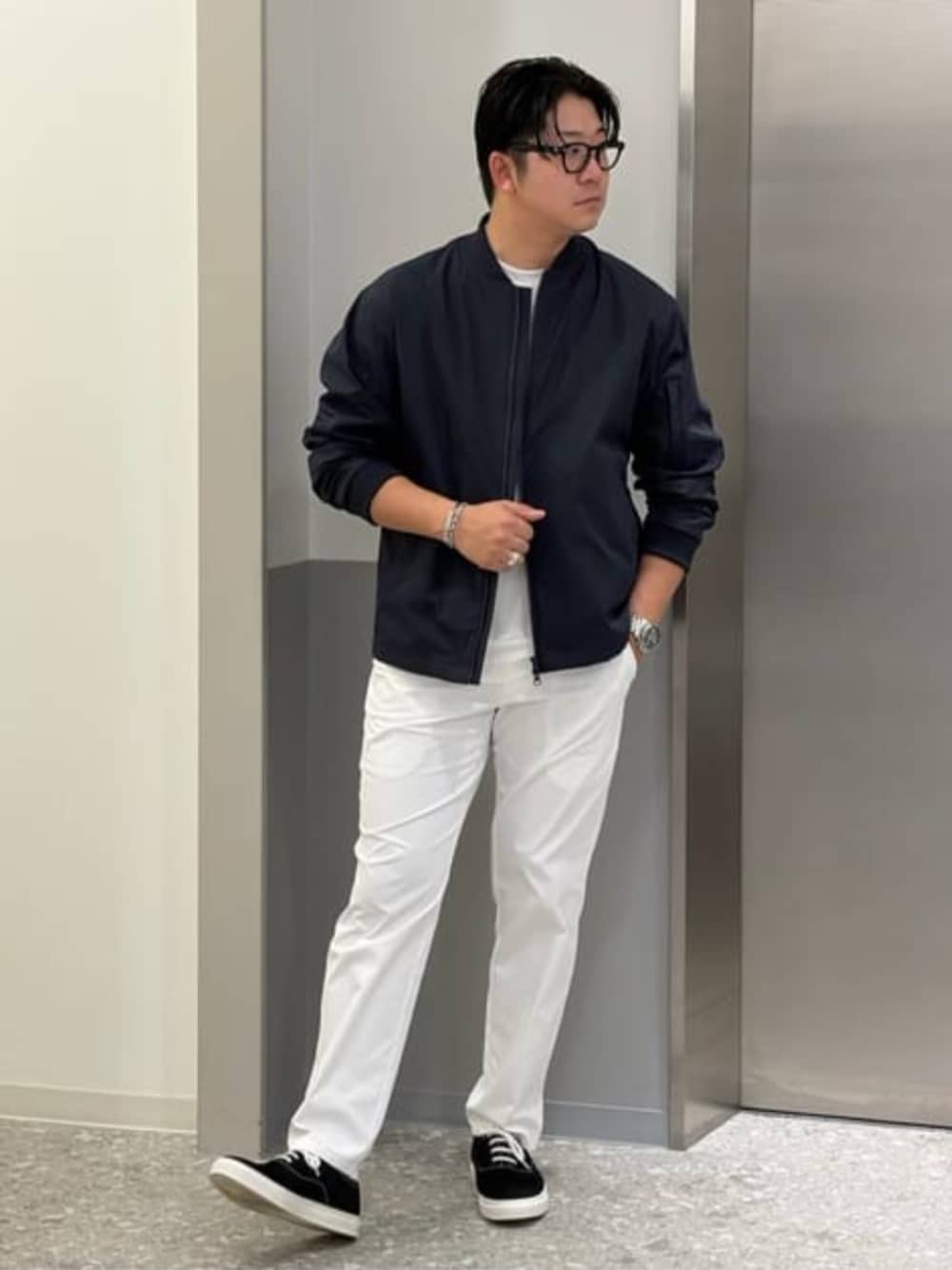 ビジネスシーンでもカジュアル化が進む中で、 何をどう選べばいいかわからないなど、 たくさんのお声をいただく中で、 オフィスでも、普段でも、 いつでもどんな時でも着こなせる アイテムたちが登場しました。 今回はMA-1を使ったコーディネートです! MA-1と聞くと無骨なミリタリーを連想しますが、 シルキーツイルのクリーンな生地感と、 リブゴムが付いてないことによって ミリタリー感を減らして都会的な印象に。 セットアップでも着用できますが、 あえてホワイトパンツを合わせて よりクリーンな印象に仕上げました。