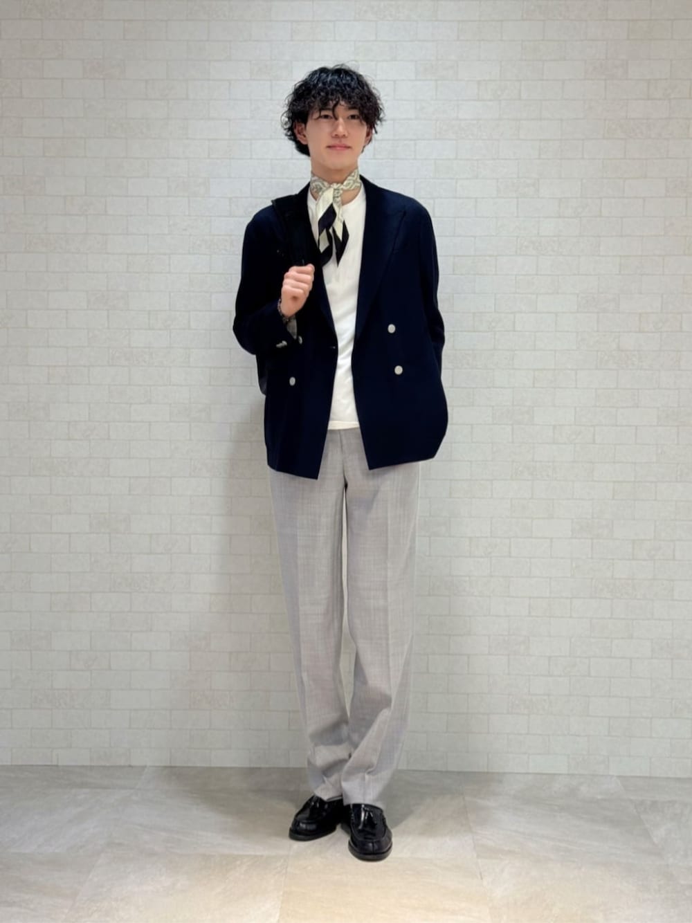 『GOOVI』オリジナル、尾州産素材を使用したダブルブレストジャケット。 竹を原料としたバンブーレーヨンとウールを交織し、シルクのような光沢と滑らかな肌触りを実現しました。 通気性の良いメッシュ織りにより、夏でも蒸れにくく快適。 吸放湿性や抗菌性も備え、機能面も抜かりなし。 ややマットなメタルボタンが大人の品格を引き立て、 段返り襟や浅めの内合わせなど、モダンなディテールも魅力。 クラシックなのに今っぽい。 羽織るだけで決まる、GOOVIの王道ブレザーです。