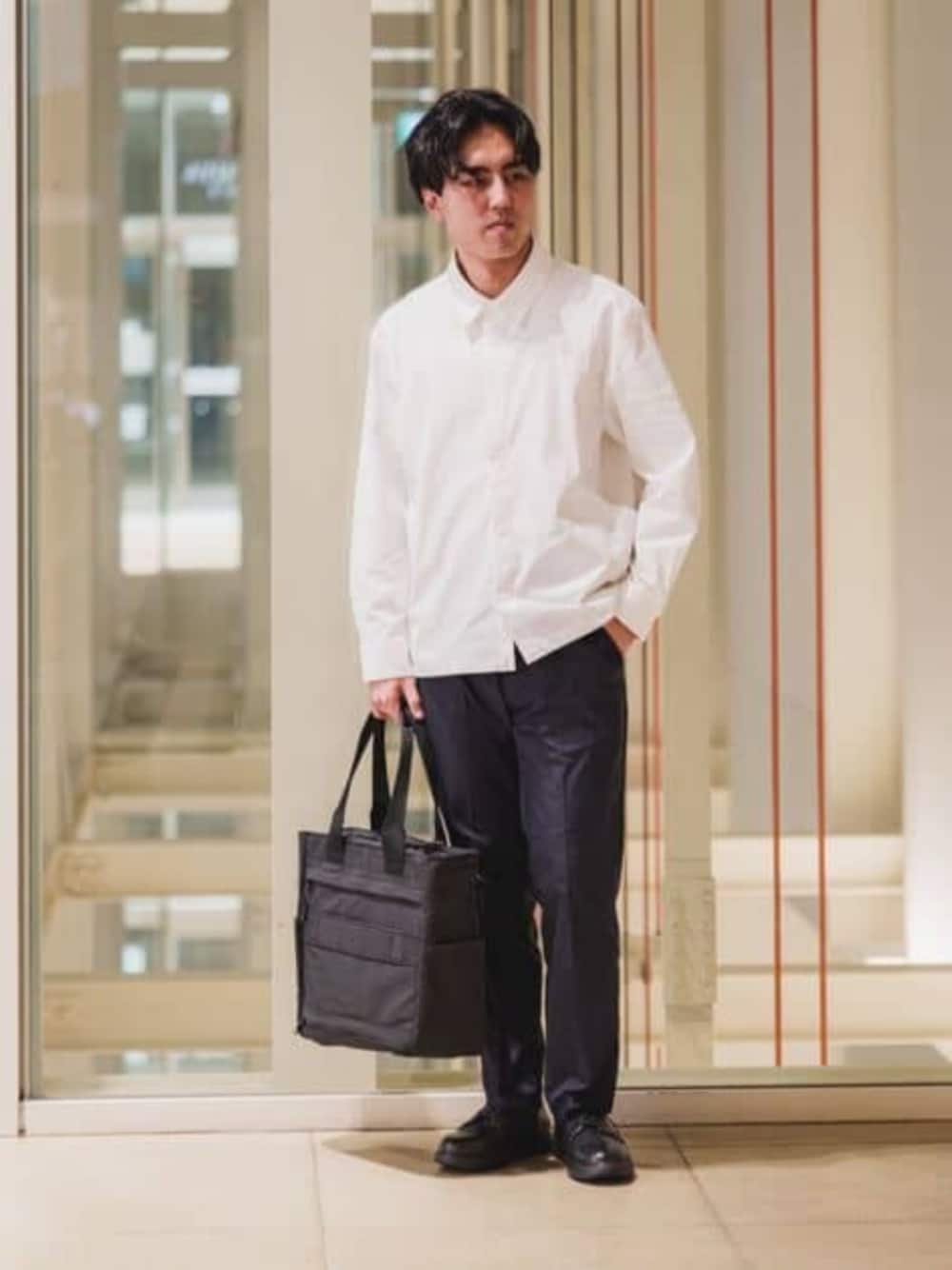今回ご紹介しますのは、非常に着回ししやすいシャツアウターでございます。 シルクのような質感を再現した素材は、ラグジュアリーな雰囲気を持ちつつディティールをスポーティーよりによせることで、公私共に使いやすいアウターに仕上がりました。 一枚着としてはもちろん、インナーシャツとしてもお使いいただけます。 ルーズフィットかつ適度なストレッチ性があり、楽にお召しいただけます。 パンツには同じくシルキーツイル素材のものを合わせました。 適度な肉厚さで、シーズンレスに活躍してくれるアイテムの一つです。 私の体型ですと、上下ともにMサイズでジャストでした。