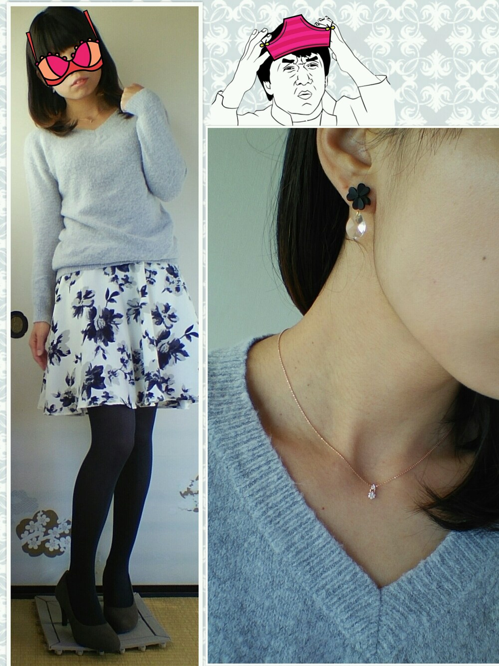 可愛い人に憧れて可愛い風なポーズを撮ってみたけど顔がどうしようもなくてがっかりしたので、目にビキニをつけて、ジャッキー風なスタンプをウーロン(ドラゴンボール)みたいにしました。 ニットは去年買ったもこもこニットで1990くらいでした。 今日は暑かったです…
