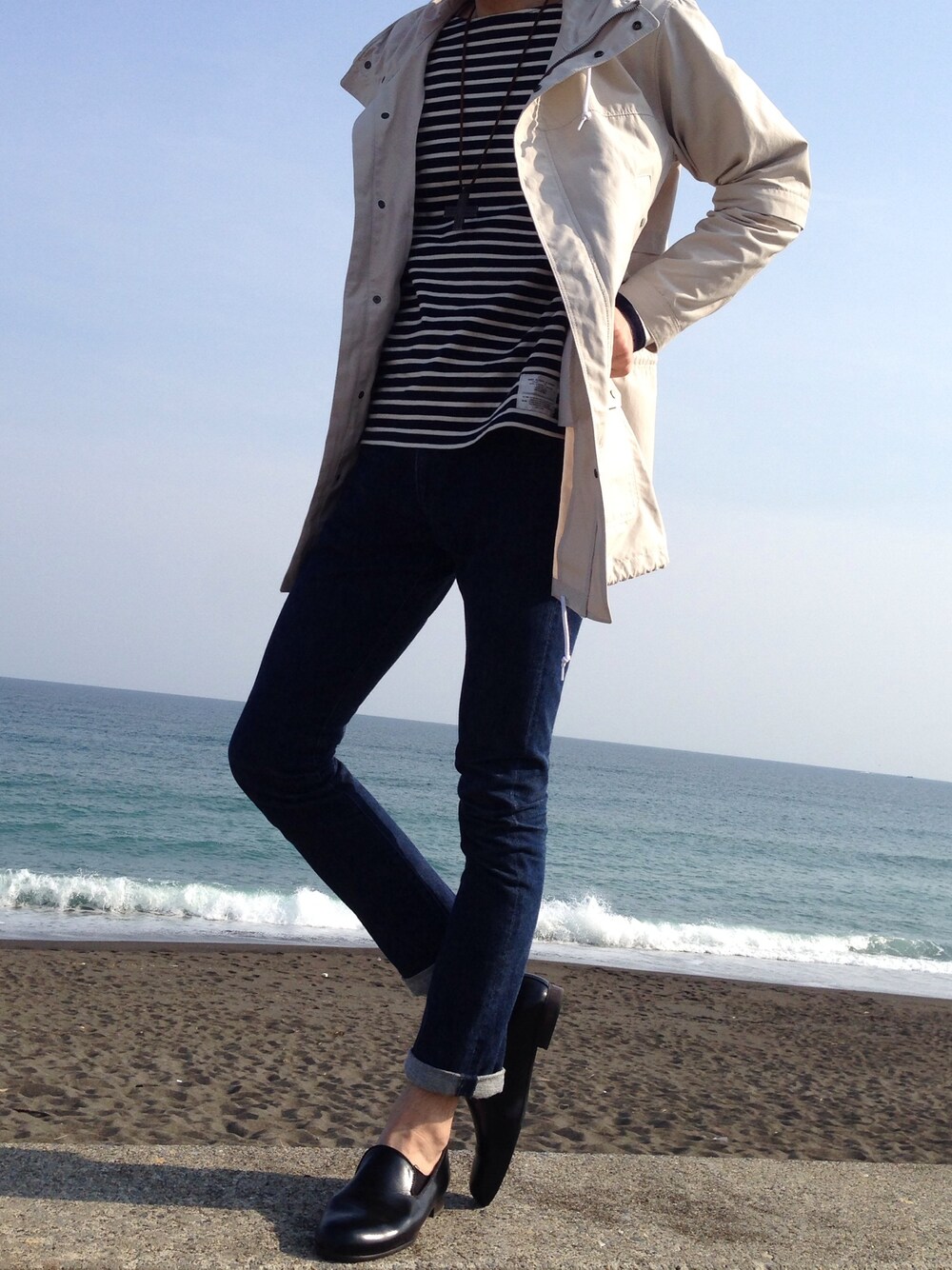 房総に行ったときのやつです。 まだ寒かったんで軽めのアウターをあわせてみました。 気取り過ぎてますがご了承下さい笑 海は泳ぐより眺めてるほうが好きです^ ^