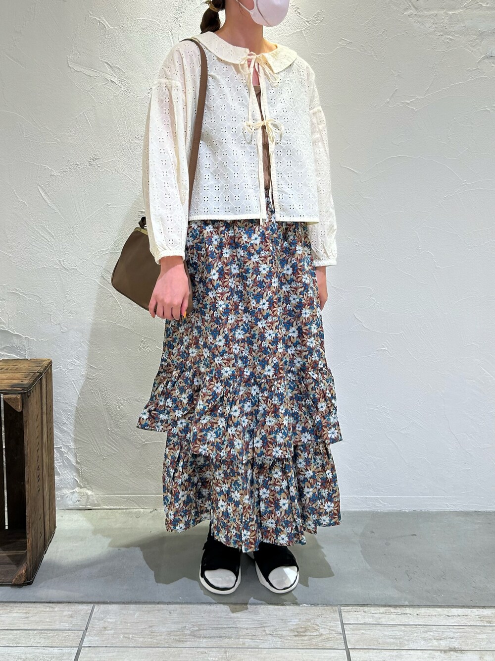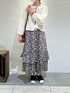 少し秋に向けてのガーリーコーデです🍂 ブラウスは丸襟や前リボン、総レースのデザインになっていてとても可愛い1枚です🌷前を開けて羽織りでも着れます! スカートは総ゴムで履きやすく、秋らしい花柄にティアードのデザインが可愛いです☺️