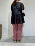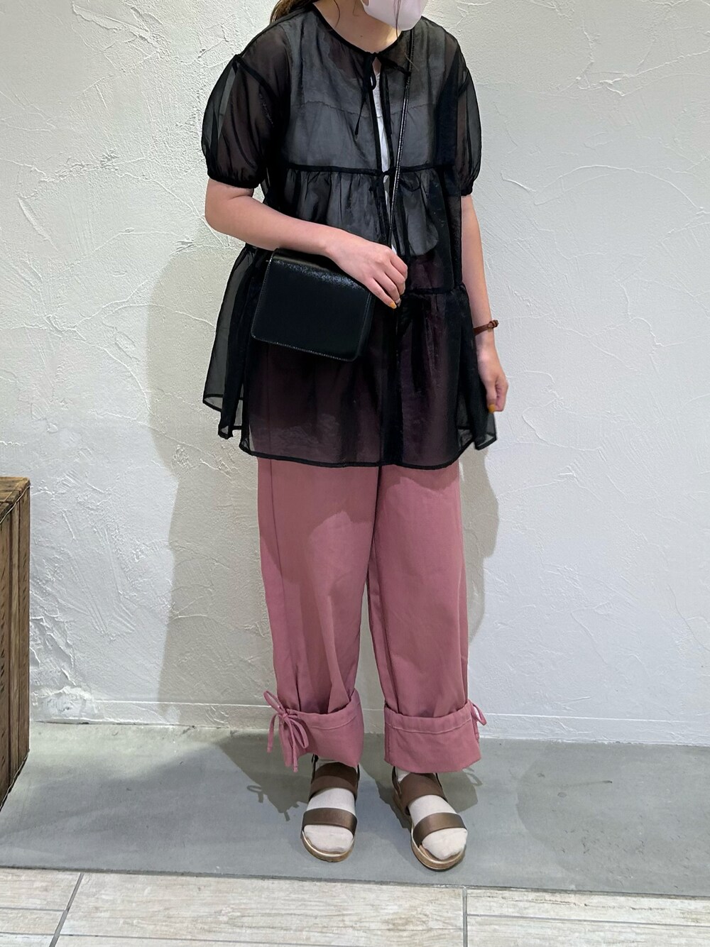 トレンド感のあるコーデで着てみました.°⑅色はブラック×ピンクでメリハリをつけました🐦⬛ ブラウスは2WAY仕様で透け感あるシアー素材になります🙂ティアードになっているのでふんわりしたシルエットも可愛いです🌷 パンツは少し濃いめのピンク色で秋服に合わせやすい色味です!裾の折り返しリボンがワンポイントになります☺️