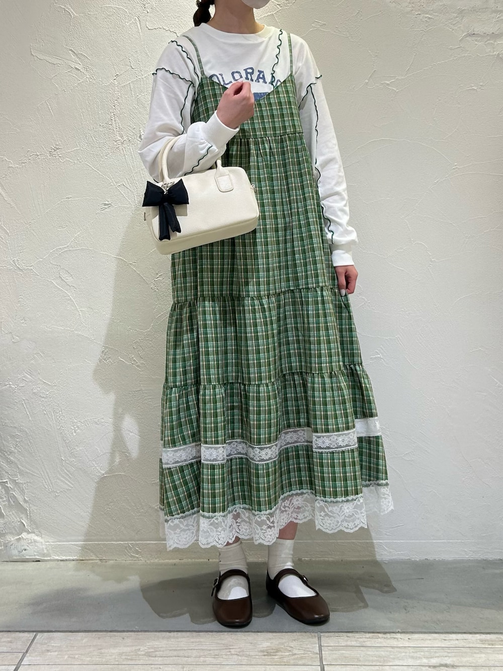 入荷してから大人気のチェックキャミワンピースをメインに合わせました!ワンピースは肩のアジャスターで長さ調節が可能です◎ 裾にかけてふんわり可愛らしくレース付きなところが目を惹きます☺️ 新作のバッグはリボン付きでショルダーバッグにもできます!!
