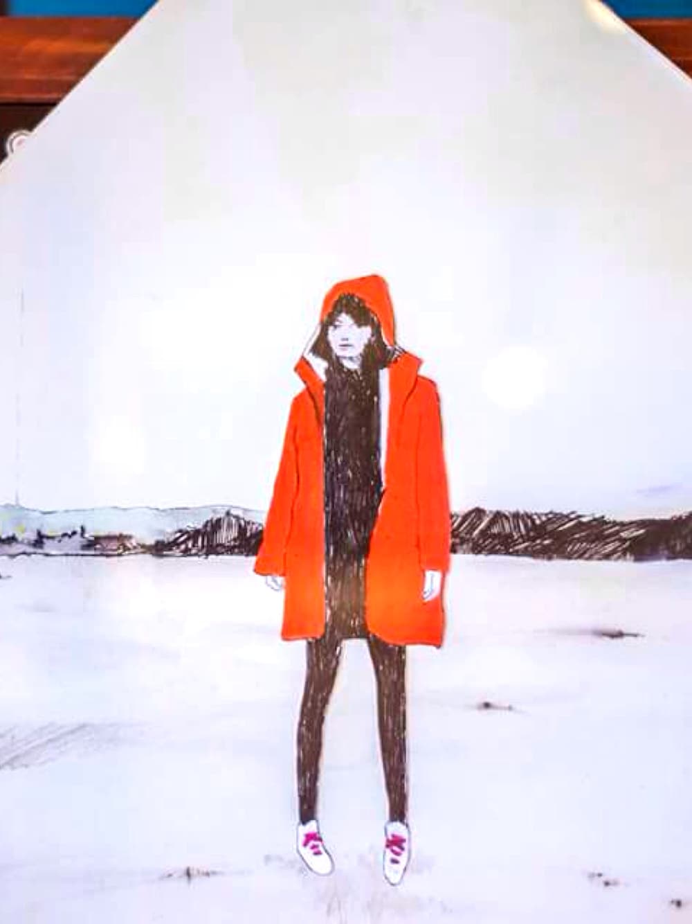 レッド系のポンチョ、ブラック系のニット/セーターを着用したレディースの春コーディネートの1枚目の写真