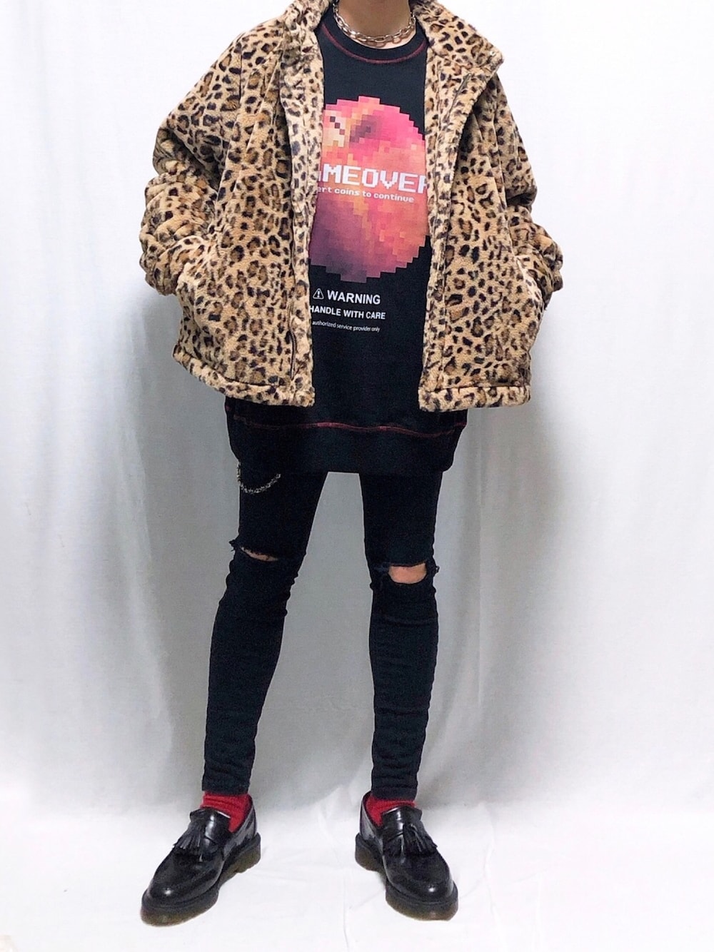 いつも沢山のいいねとお気に入りに入れていただきありがとうございます😊 今日はイケイケな感じのコーデです(笑) ヒョウ柄のアウターもアップル柄のスウェットもパンチが強いですが、合わせたら意外とケンカせずに仲良くしてくれました🐆🍎