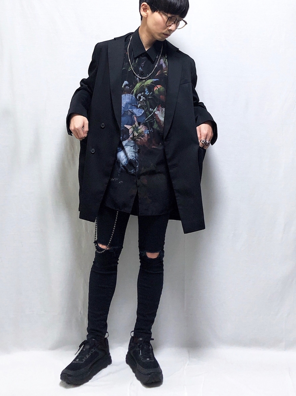 いつも沢山のいいねとお気に入りに入れていただきありがとうございます😊 かなり今さらですが、HOKA ONE ONEのBondi6を購入しました! 皆さんのレビュー通り、見た目のボリューム感に反して軽くて履き心地がすごく良いです✨ 黒スキニーとの相性はやはり抜群でした👍 そして何より身長が盛れます(笑) 久しぶりに上下黒の黒コーデしたかったの で、ジャケットと花柄シャツの黒コーデの中に合わせてみました☺️