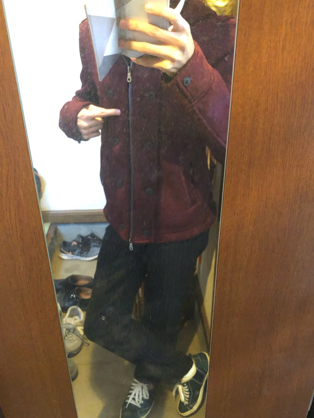 ワインレッド🍷🍷🍷 華やかさがありつつもクールで好きです! スニーカーが濃いグリーンなので、赤とのコントラストがありますが、間のパンツが黒なのでメリハリ且つ落ち着きがあるかな、と思います😊