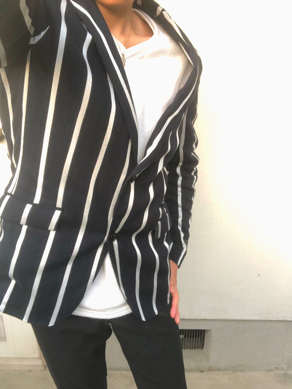 ストライプのジャケットかっこよくないですか!!??😆😆😆 着るだけでオシャレ道で一線を画すことができる、と思います!笑😅🙁 スラックスやインナーもこのジャケットを引き立たせるためにシンプルに!(それでもパンツには若干柄が入ってたりと遊び心もあります☺️