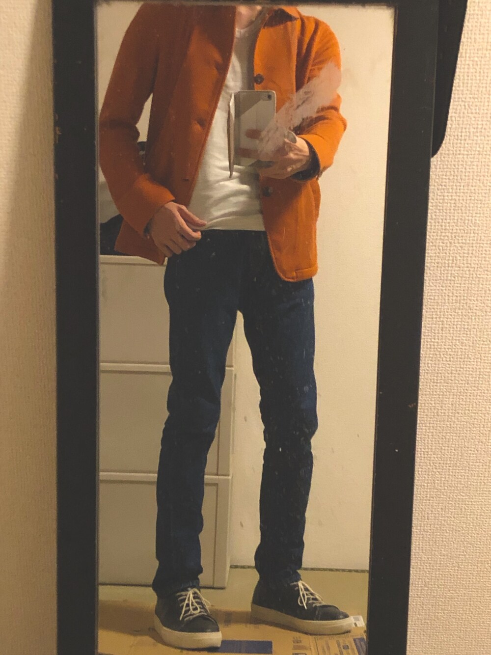 今日は気温もそこまで高くないので、お気に入りのジャケットを着ました! ジャケットを軸にしたくて、シャツは若干模様入りのホワイト、パンツはシンプルにジーンズにして、ケンカしないように意識しました😃 スニーカーも黒なので、遊び心がありながらも落ち着きがあると思います。紐が白いのは隠れポイントです😚