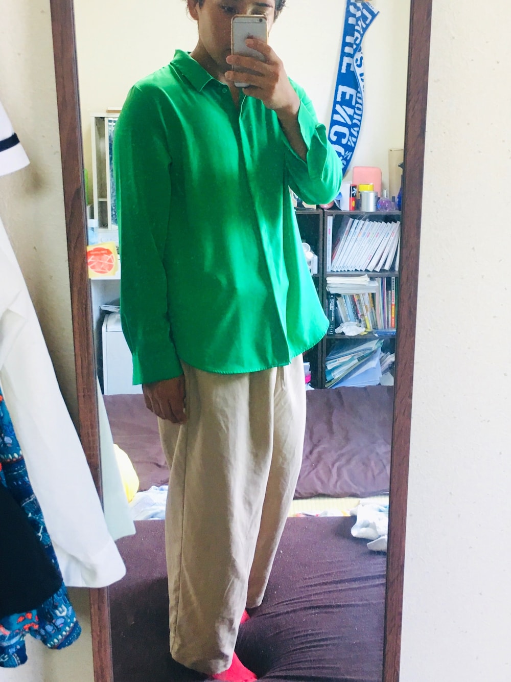 そう、iPhoneならこの画質。そして緑のsaleしてたレディースのシャツです!ガタイが良くても余裕で入りました〜!タックインもOKなパンツですので着やすいですね笑