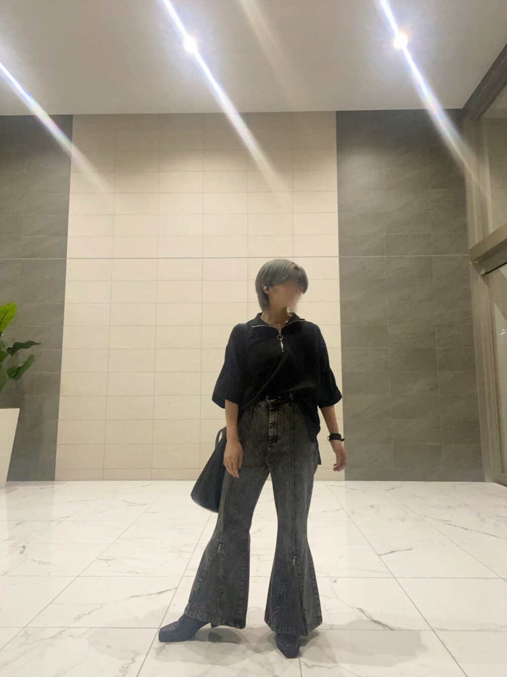 キレイめワントーンコーデ 最近買ったお気に入りのシルエットが綺麗なフレアデニムとヒールブーツとハーフジップを合わせてみました。 いつもいいね・お気に入り・フォロー・コメントありがとうございます😊