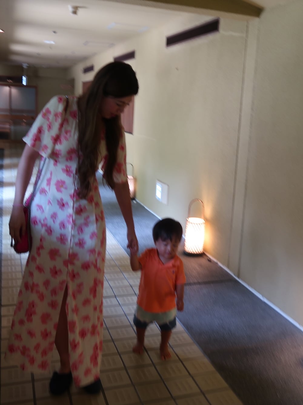 フラワープリントのロングワンピースでリゾート感。裾がカットアウトされているのでさばきやすく子供と一緒でも動きやすいのもポイント。