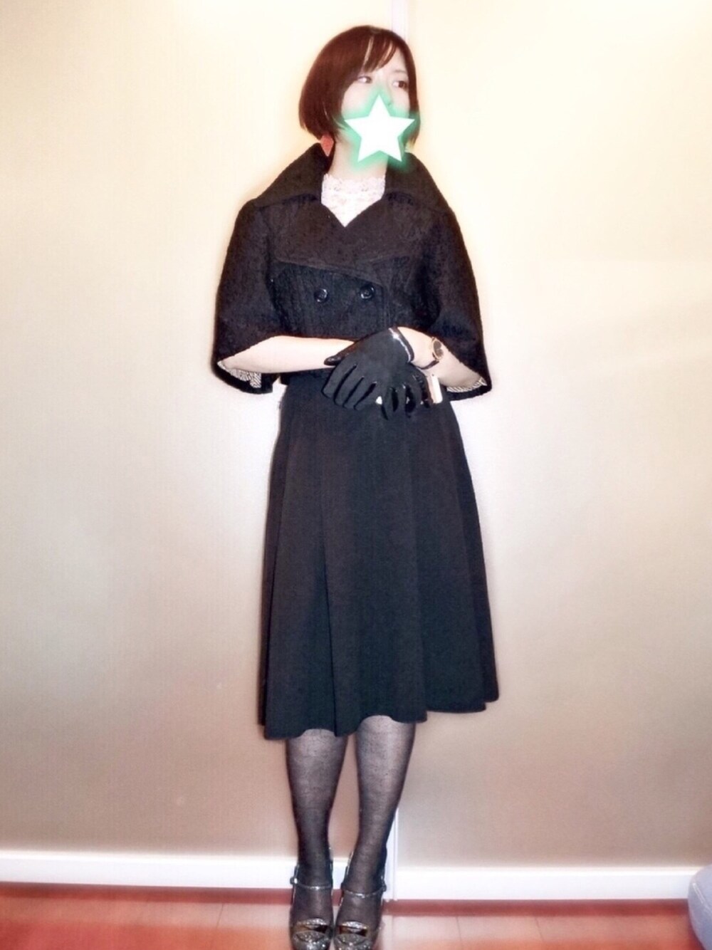 改めて見るとお洋服、黒系ばっかり৲( °৺° )৴ 半端な袖丈×グローブは上品感がでて好きです。上着は古着屋さんで見つけました。 日中や屋内あっついので、インナーは未だ夏物…。