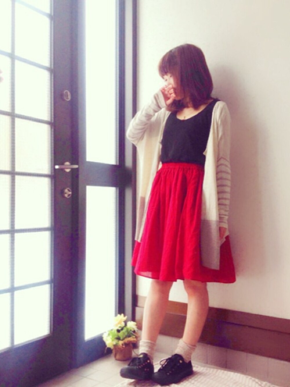昨日はすごい雪でしたね。 雪は好きですが、雪かきが大変だから困ったものです。 今日は友人と会う日!のコーデです。 赤いスカート、トップスなに合わせよう〜と色々考えるのが楽しくて…(*´ω`*) かっこ良くも着たいなぁと思ってブラック合わせたけど、結局カーデで甘くなってしまった(笑) カーディガン前はバイカラーで、袖と後ろはボーダーになってます。一癖あるデザインだいすき! コンバースはゴールドのスタッズが着いております。 今日は雪で転びませんように…☃