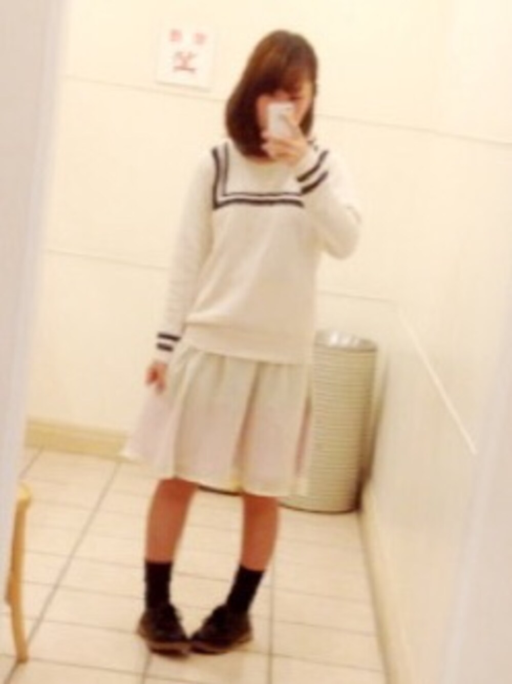 ホワイト系のニット/セーター、ホワイト系のスカートを着用したレディースの冬コーディネートの1枚目の写真