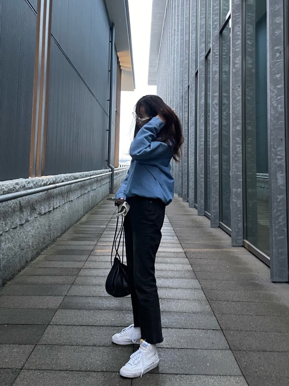 フリマで買ったブルーのアウター形がお気に入り🤍🤍 いつもブーツしか履かへんけどたまにはスニーカーも良き✊🏻🔥