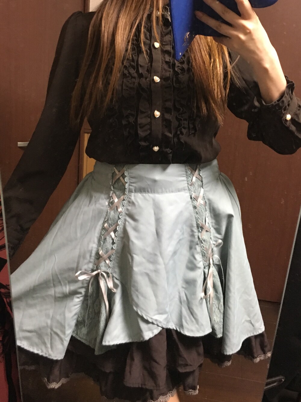 夏のクラロリといえば、やっぱりチョコミントコーデです^_^ わたしは仕事の都合上一年中長袖を着用しておりまして、少しでも暑苦しくないカラーを選びます♡ こちらのスカートもお気に入りのタイプで 2カラー入荷しております♡ 他色買いもよいと思いますよ♡♡ お待ちしております!
