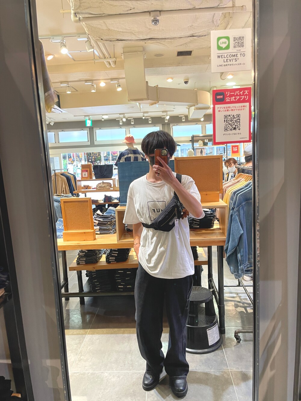 HUFのTシャツを着てゆったり感を出して黒デニムで脚長効果を持たせて誰でもできるコーデをしました