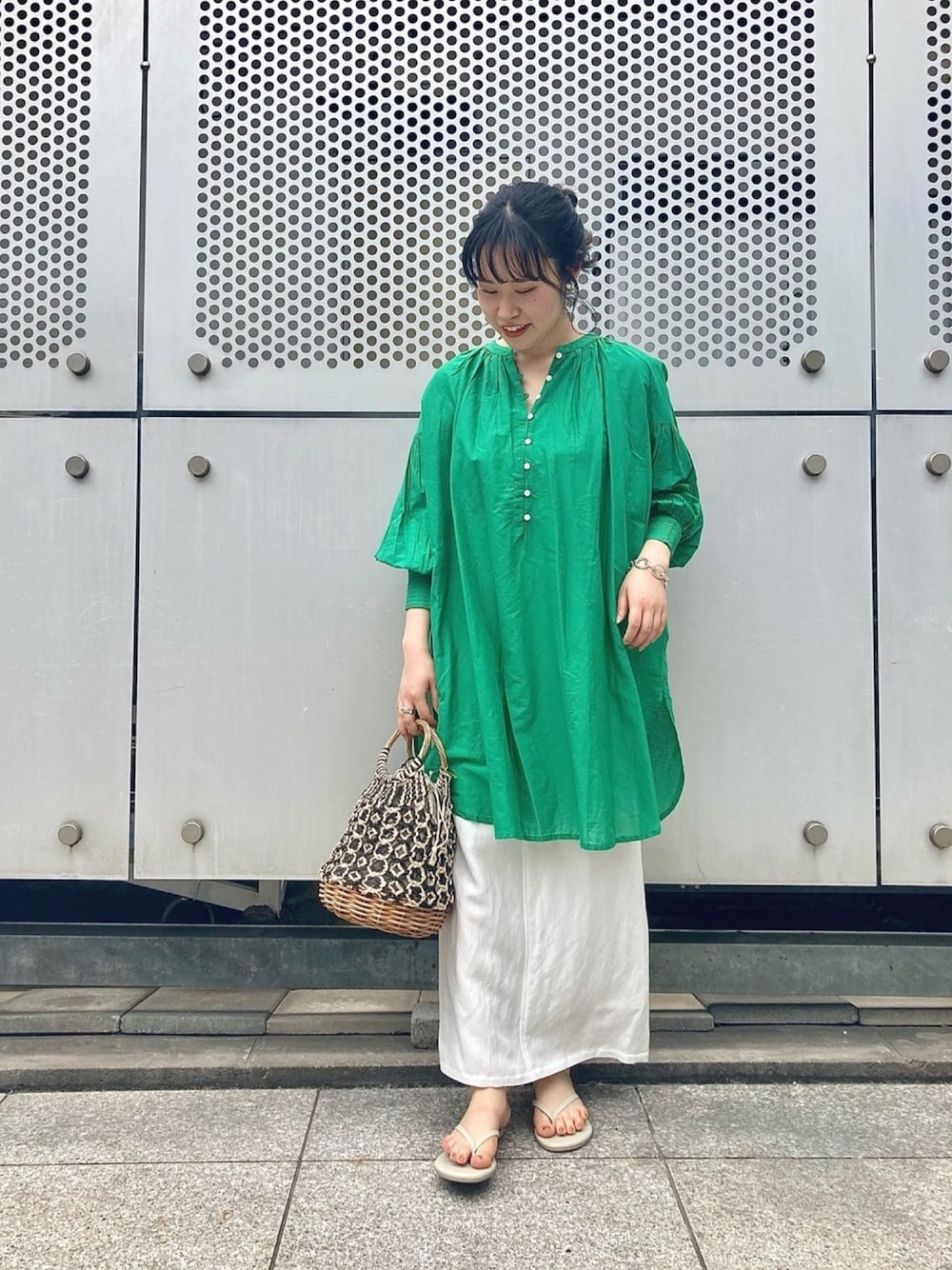 結構暖かくなってきてビビッドなカラーも気になる〜🤔💚 ブラウス以外のアイテムはシンプルにモノトーンで☺︎