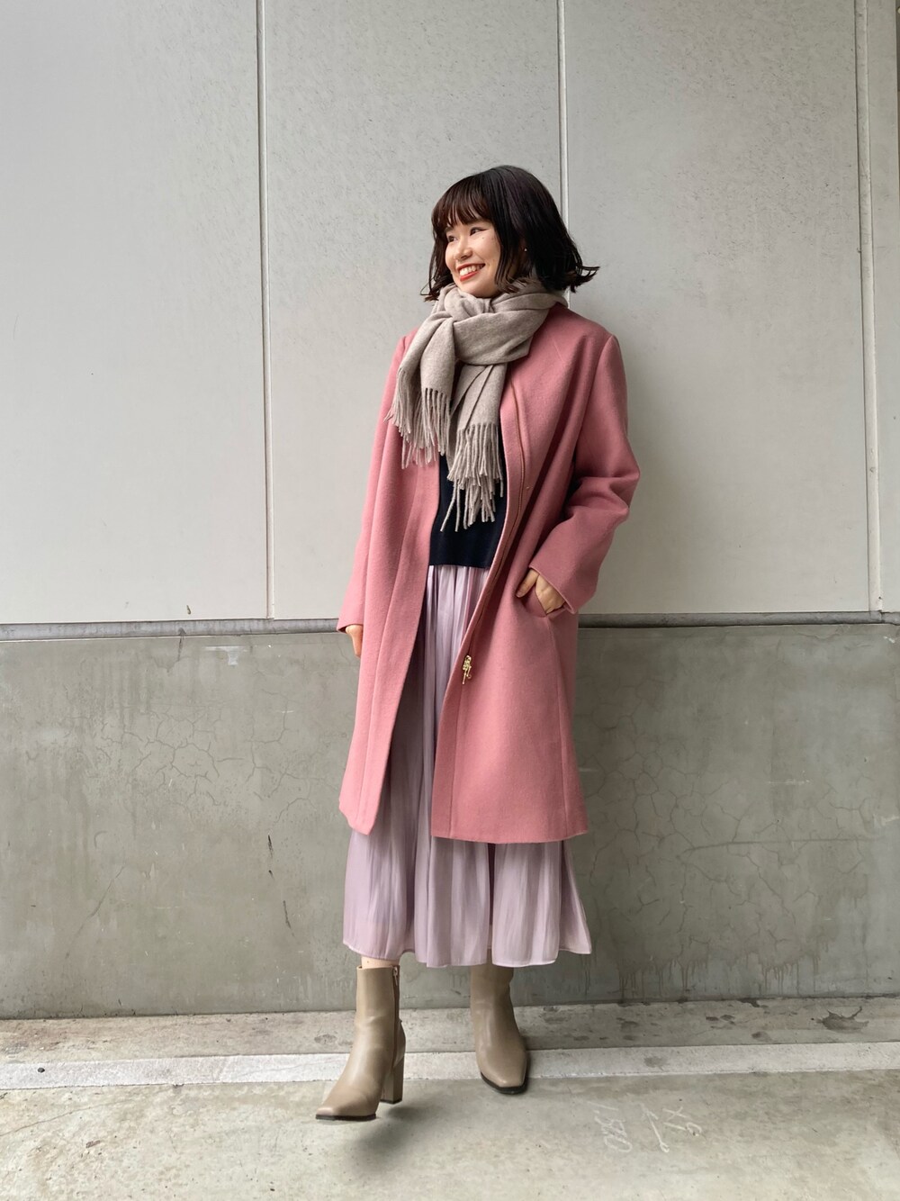 くすみピンクで大人なフェミニコーデ🍑 マフラーでボリューム出すと可愛い☺️