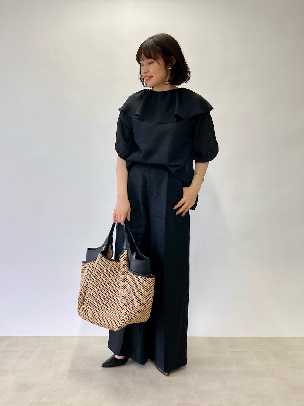 春のブラックコーデ◼️▪️ ブラックカラーでも透け感のあるブラウスに、リネン素材のボトムス合わせで涼し気です🌿
