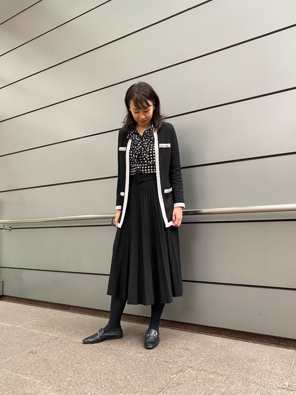 フリルブラウスをモノトーンでまとめると甘くなりすぎずに着ていただけます! ブラウス 10-02-01-008 1サイズ カーディガン 30-02-11-903 1サイズ ニットスカート 30-02-08-902 1サイズ