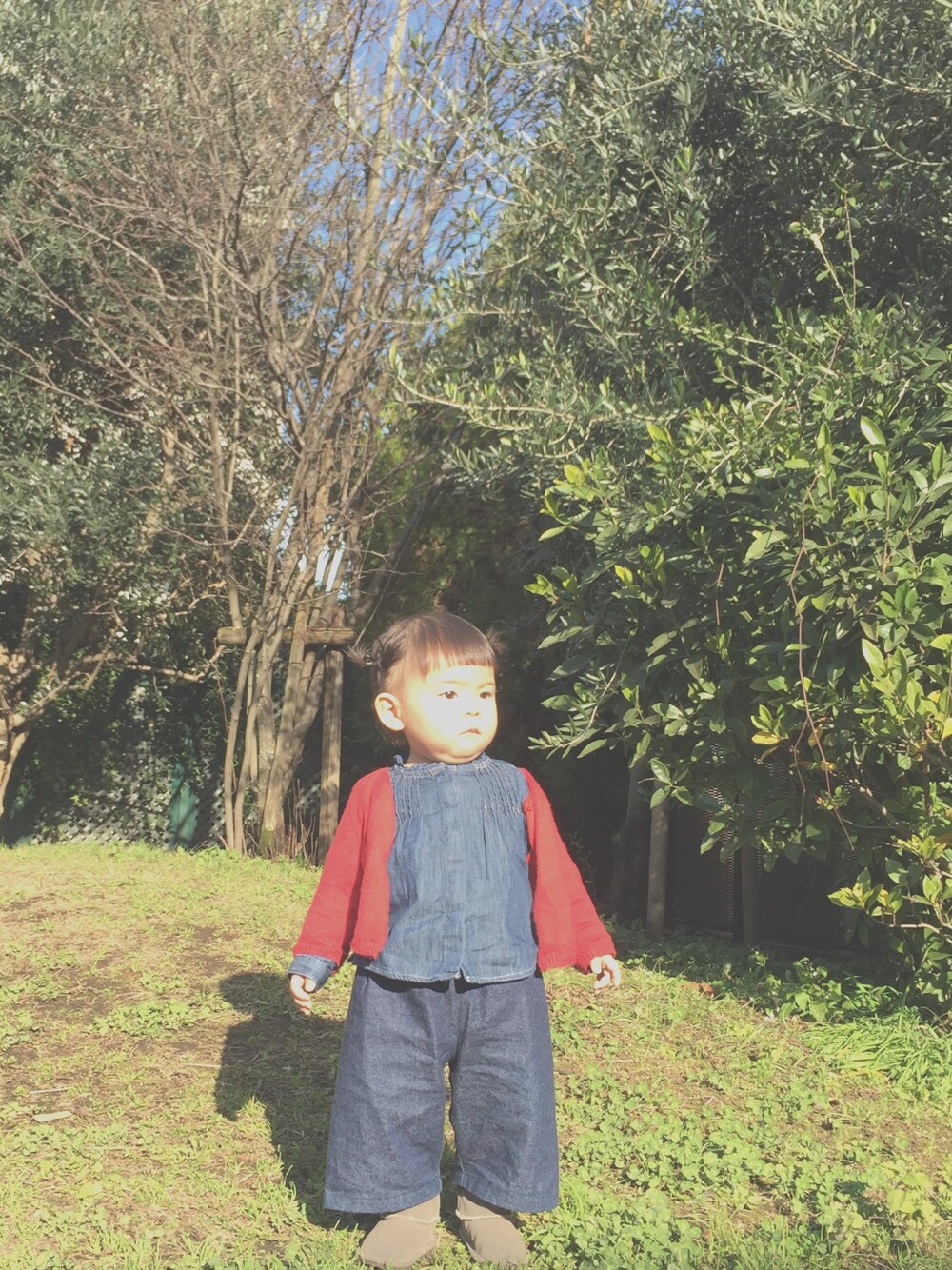 吉祥寺をさんぽしたとき。 カーディガンは赤ちゃんの時に60サイズを買って、80のいまもボレロ風に着られている!