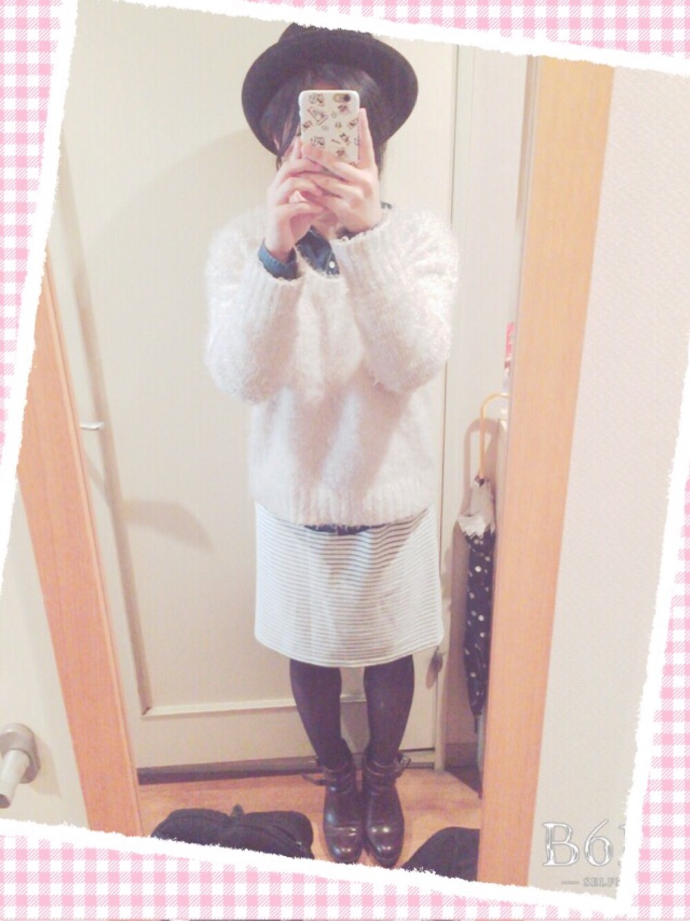 ベージュ系のニット/セーター、ホワイト系のスカート、ブラウン系のブーツを着用したレディースの冬コーディネートの1枚目の写真