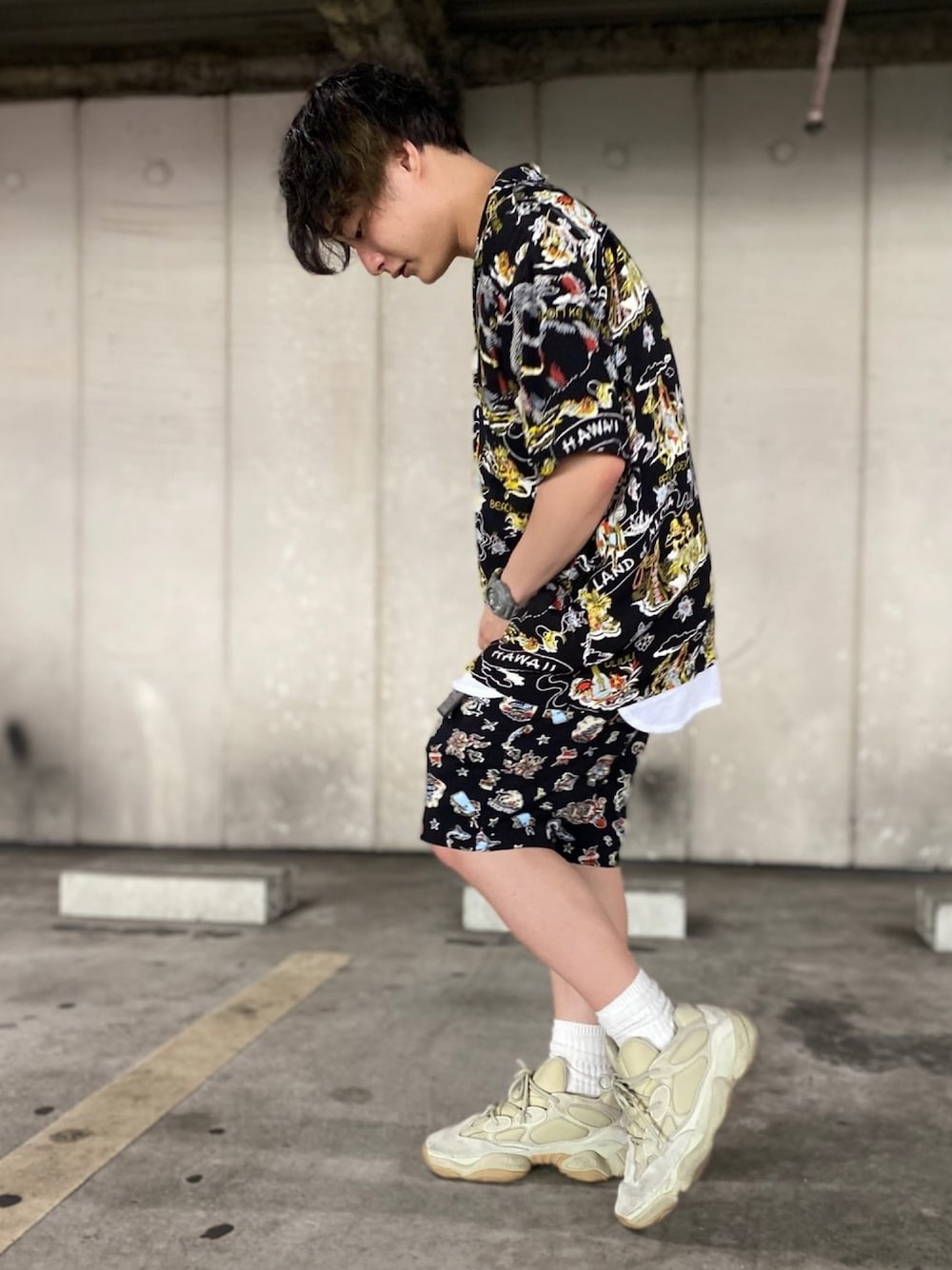 【実はセットアップじゃないコーデ】 ハワイに行った時にノリで買った アロハシャツが超お気に入り! 日本で生地を染めてハワイで縫うという メイドインハワイに拘ったブランド! アローズでも取り扱いがあるらすぃ〜 これセットアップで着たいなと思ってたら この前買ったギルドプライムの ショーツと柄似てるやん!と思って 合わせてみたら遠めセットアップなりました! 近くでよく見たら若干ちゃうやん! ってなります!