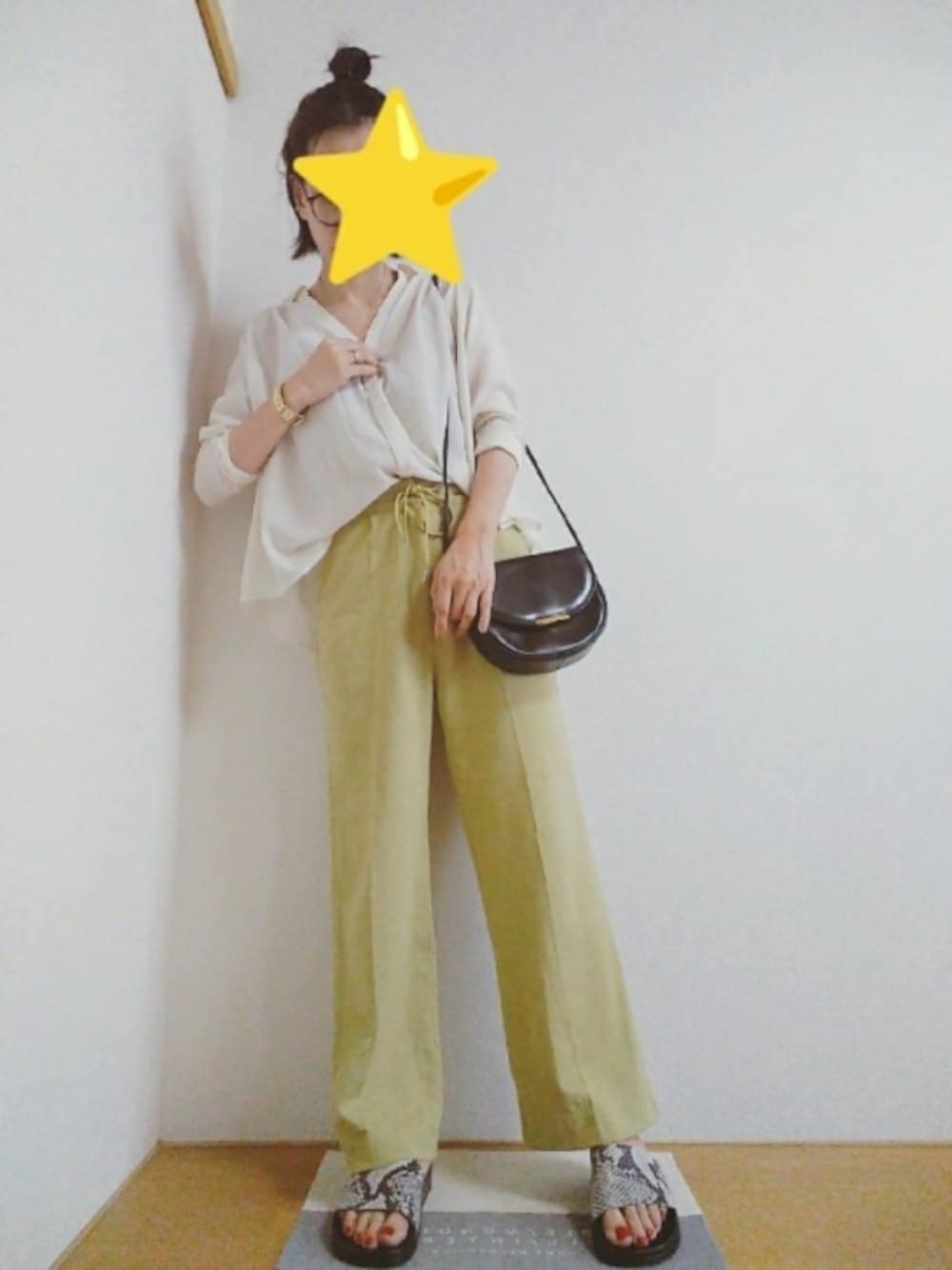シャツコーデ。 イエローのパンツで明るく。 アクセはイヤーカフ、コインネックレスとゴールドのブレス。 小物は黒で締めました。 シャワーサンダル楽チン。