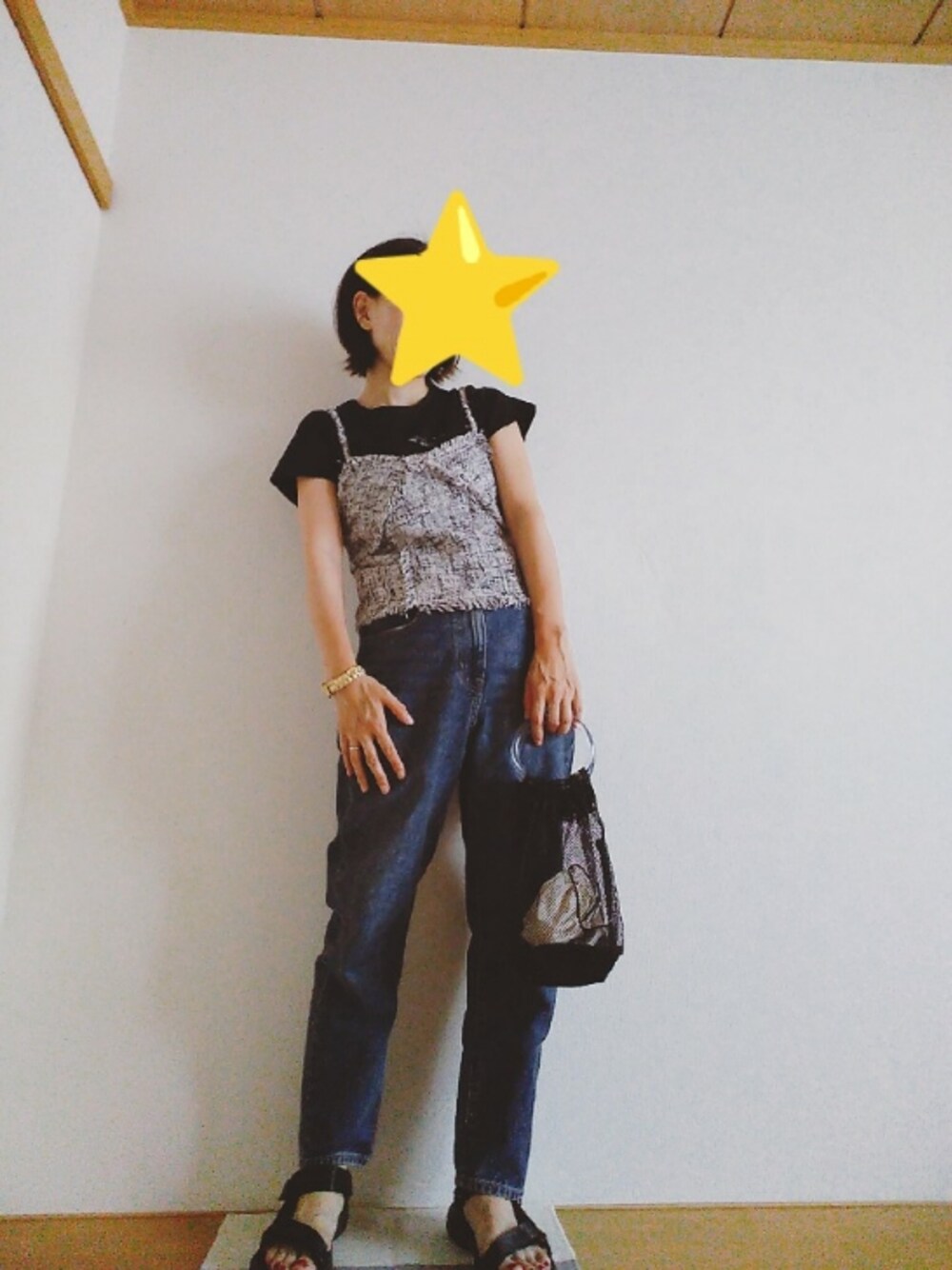 小さくロゴの入ったTシャツ490円 …にビスチェ。ブランド名、忘れてしまった…。 上はコンパクトなシルエット。 下は楽にはけるデニム。 小物はスポーティーな感じにしてみました。 GUのバッグは値下げで190円になっていて、即決したもの。 気に入って結構使ってます。